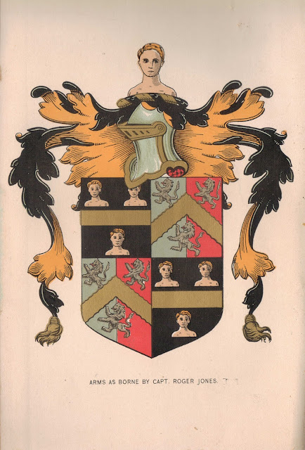 By the mid to late 1980's, several topics regarding the Jones surname and coat of arms came into focus. First, as a surname, there were more than 100 Jones families that had a "coat of arms" registered in Burke by the 1840's. [post of 6 November (1)] Second, a fair number of references were available to help understand the basics of "Armorial Bearings", and a general understanding of this topic could be achieved. [post of 28 December (2)] Third, there seemed to be a clustering of symbols among these arms with 45% having some form of the "lion". Various other symbols appeared being on the most part less than 10% for each symbol. [post of 1 February (3)] Four, beside the symbols, there were a number of ""tinctures" (base colors) scattered about these shields with the color "gold" being the most frequent (37%). [post of 2 March (4)] Five, the geographic location of these Jones families could be outlined showing the counties of England, Wales, and Ireland that contained these arms. [post of 26 March (5)] Six, on this side of the great pond, an attempt to identify those families who were "Entitled to Coat Armor" had been published from those in Virginia where my own Jones family arrived in 1649. [post of 27 April (6)] Finally...seven, a Jones family from my own home town published in 1891, an account of "Captain Roger Jones" that contained a coat of arms dating back to London. [post of 14 May (7)]